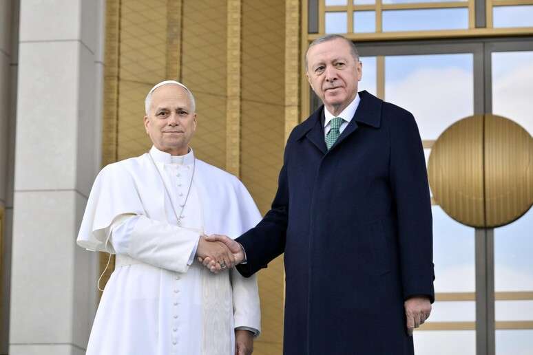 O discurso de Erdogan foi realizado na biblioteca do palácio presidencial, com a presença de Leão XIV, que faz sua primeira visita internacional desde o início de seu pontificado.