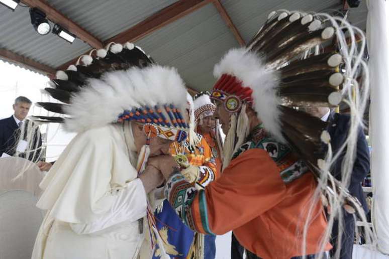 Papa Francisco recebe cocar de chefe indígena no Canadá