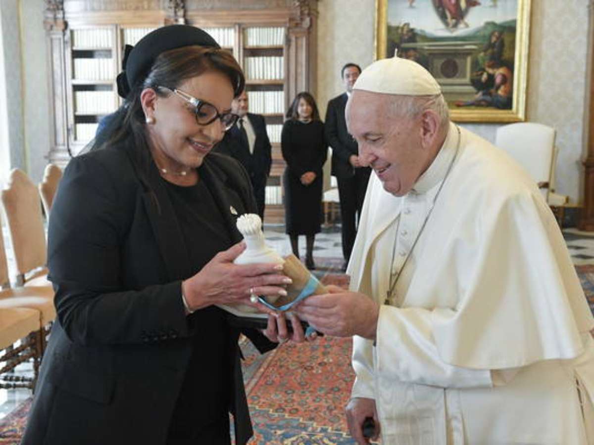 A presidente de Honduras presenteou o Papa com uma biografia dela própria, uma estátua da Virgem Maria e um rosário de madeira, enquanto Jorge Bergoglio retribuiu com um ramo de oliveira em bronze, documentos papais e um livro.