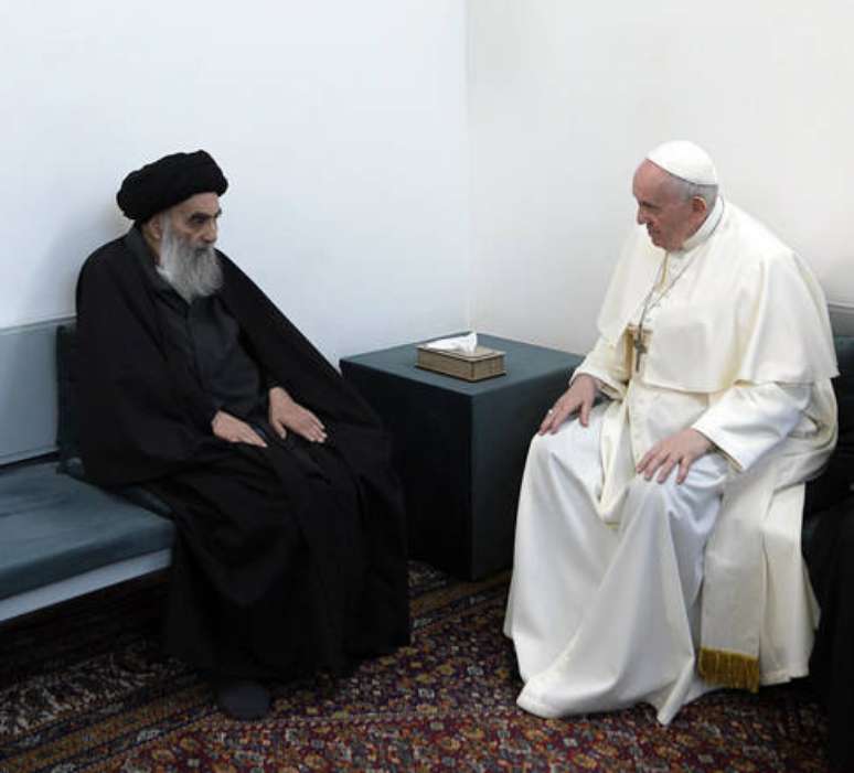 O papa Francisco teve um encontro histórico neste sábado (6) com o principal líder xiita do Iraque, o grande aiatolá Ali al-Sistani, na residência do religioso muçulmano em Najaf, cidade que fica no sul do país.