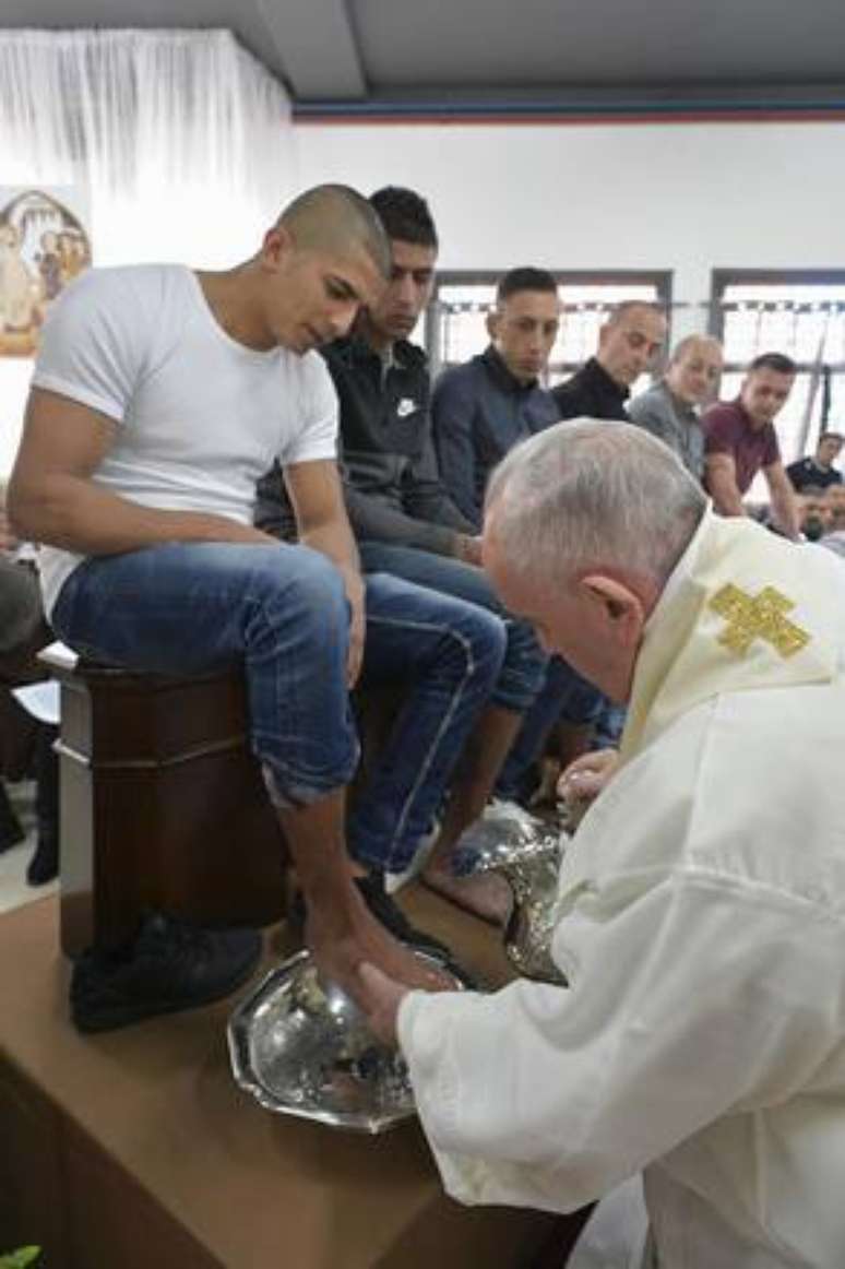 O papa Francisco lavou os pés de um presidiário brasileiro na Penitenciária de Velletri, nos arredores de Roma, em um dos ritos mais tradicionais da Semana Santa, na manhã desta quinta-feira (18).