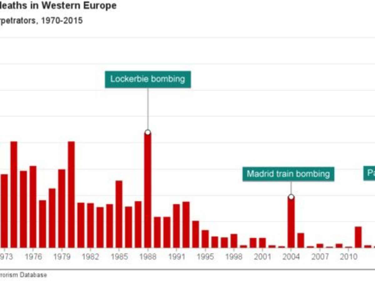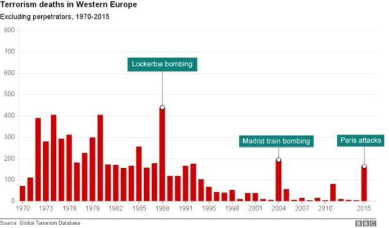 Nos anos 70 e 80, a média anual de mortos foi de mais de 150. Desde 1990, caiu para 50, apesar de os atentados em Paris, Bruxelas e Nice terem levado a um salto nos totais de mortos em 2015 e 2016.