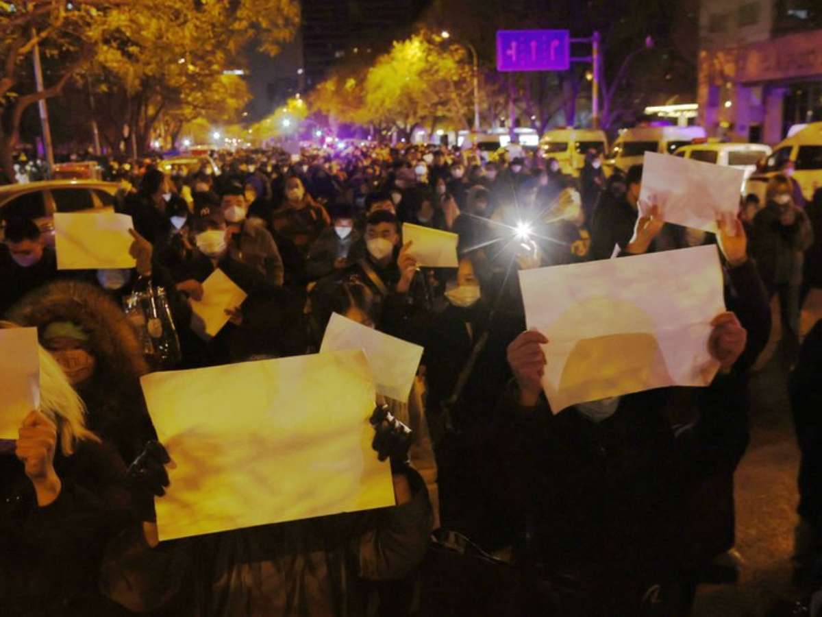 Papéis em branco - sem nada escrito - tornaram-se o símbolo. Quando instruídos pela polícia a interromper os pedidos pelo fim da política de covid zero, eles responderam sarcasticamente, pedindo mais testes e mais restrições.