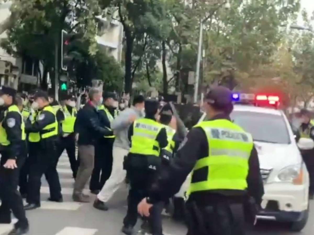 O grito de protesto então ecoa: "Xi Jinping! Renuncie! Xi Jinping! Renuncie!"