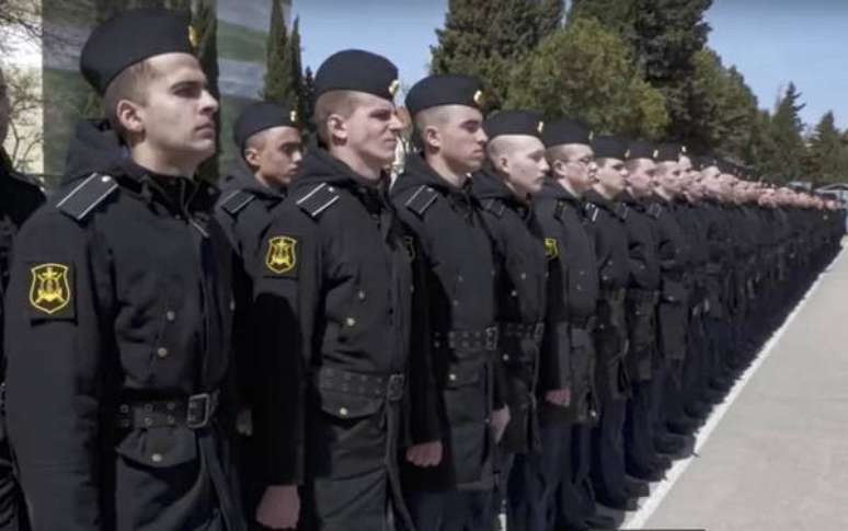 Nas imagens, os cerca de 100 marinheiros aparecem ao lado do comandante da Marinha da Rússia, almirante Nikolai Yevmenov.