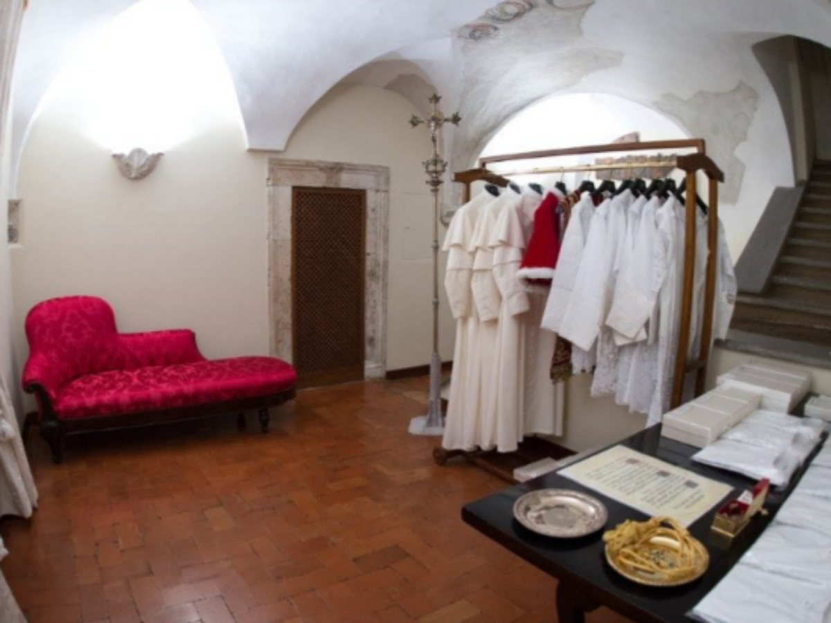 Para o escolhido, são colocadas três batinas brancas à disposição. Cada uma em um tamanho diferente. Após a troca de roupas, o novo papa tem alguns minutos para orar e meditar sozinho e, provavelmente, faz o que o nome da sala sugere: derramar lágrimas.