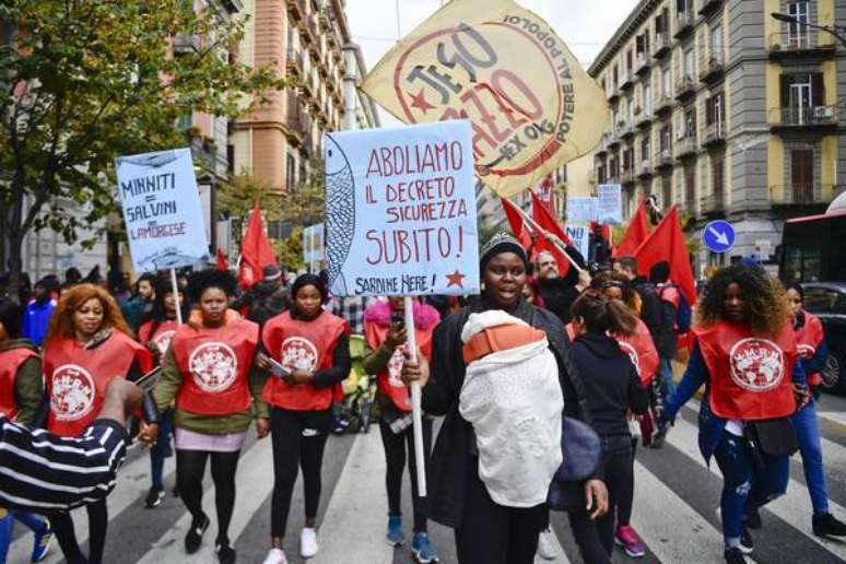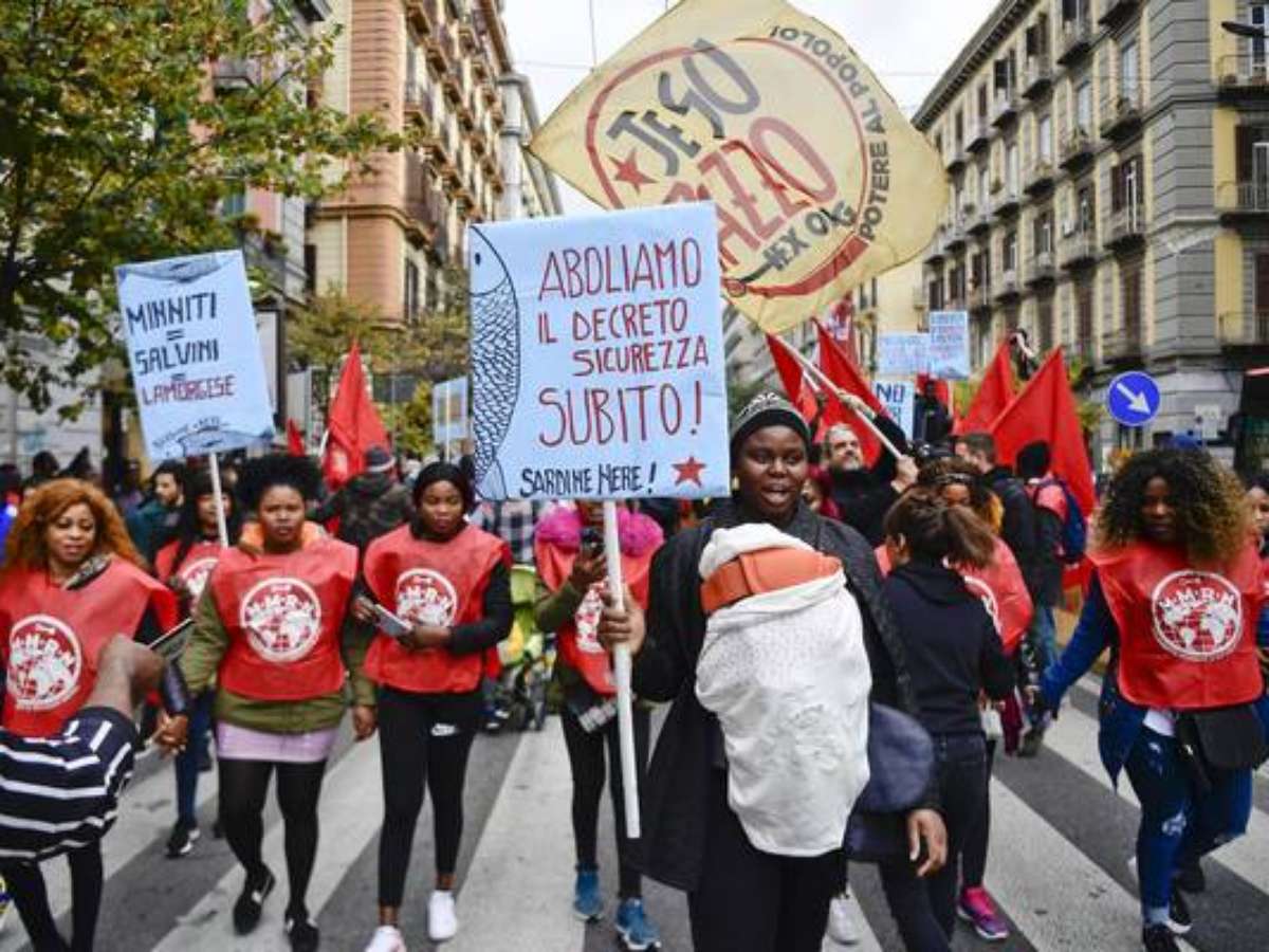 Mais de 200 pessoas do movimento de migrantes e refugiados de Nápoles, na Itália, saíram às ruas neste sábado (7) para protestar contra as políticas migratórias do país e exigir a aceleração do processo de reconhecimento da proteção internacional e a liberação de residências para solicitantes de asilo. Autodenominado como "sardinhas negras", o grupo faz referência ao grupo "sardinhas", iniciativa apartidária criada para tentar frear a ascensão de Matteo Salvini na Itália. Exibindo cartazes contra Salvini e contra a atual ministra do Interior, Luciana Lamorgese, os migrantes partiram da piazza Garibaldi e caminharam até a sede da polícia do centro da cidade. "Governos e ministros do Interior mudam, mas as políticas contra migrantes, refugiados e os setores mais fracos da população não mudam", afirmaram os organizadores do protesto. "Nossas vidas não podem mais esperar, tomamos as ruas para solicitar a revogação imediata dos decretos de segurança e contra os procedimentos do Departamento de Imigração da Delegacia de Polícia de Nápoles", que por causa de burocracia não garante a autorização de residência, acrescentaram. O movimento de migrantes e refugiados de Nápoles ainda afirma que, com esse reconhecimento, as pessoas poderão ter acesso ao "sistema de saúde, educação, além de poder negociar um salário justo no local de trabalho, circular livremente no território e ter a oportunidade de levar uma vida digna e não ser condenado a viver como fantasmas nos guetos das cidades".