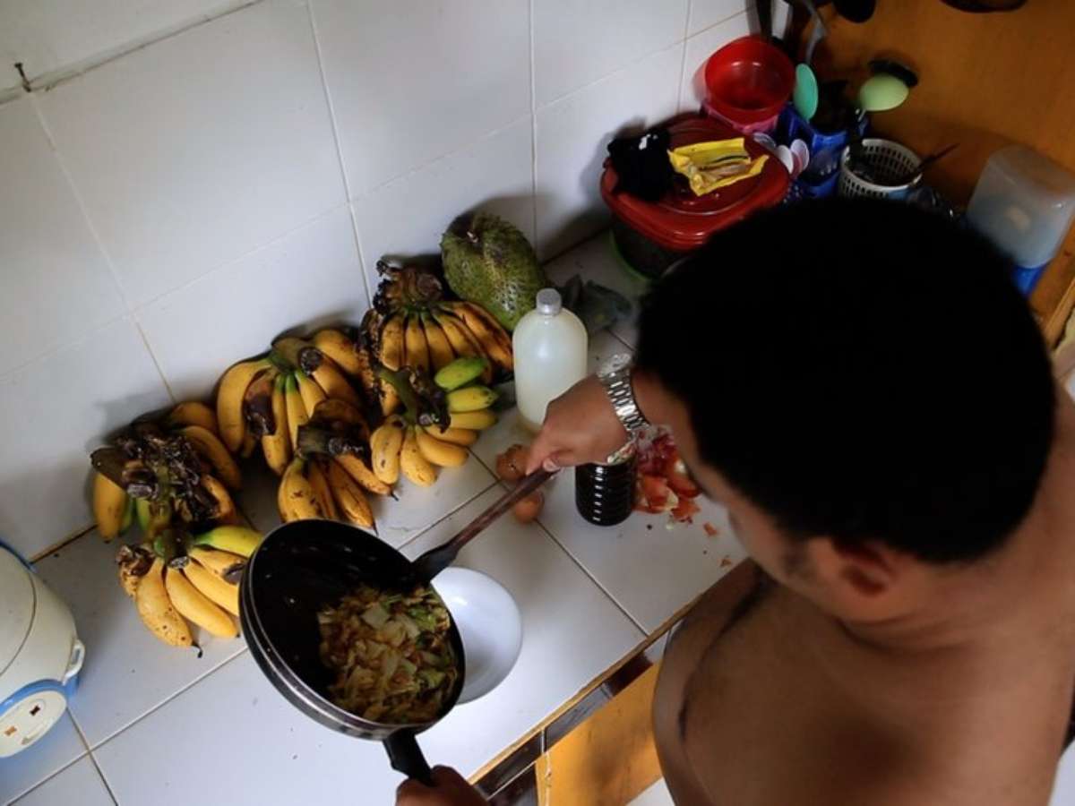 Aditya está nu. Enquanto conversa e frita ovos com caranguejos e repolho, gotas de azeite fervido salpicam na sua barriga.