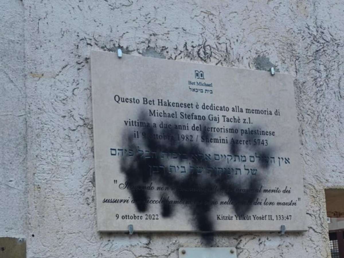 A sede religiosa traz um letreiro em homenagem a Michael Stefano Gaj Tachè, "um menino de dois anos assassinado em 1982 durante um atentado terrorista palestino ao Templo Maior" de Roma.