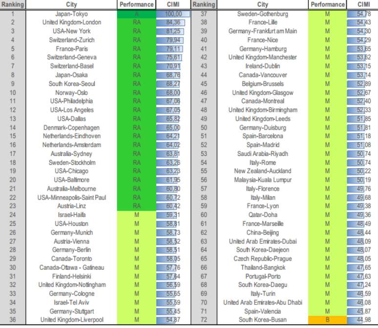 Para estabelecer o ranking, os pesquisadores estudaram 135 cidades em 55 países. Na base das comparações, estão 50 indicadores em 10 diferentes áreas que incluem, entre outras, política, planejamento urbano, tecnologia, coesão econômica, mobilidade e transporte, capital humano (habilidade para atrair talentos) e economia.