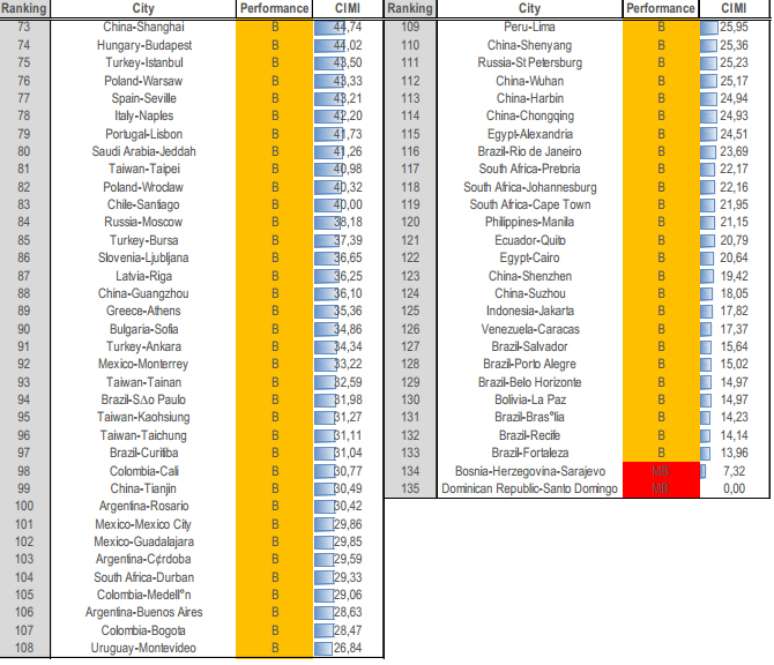 A instituição destacou que, entre as últimas posições estão, em sua maioria, cidades brasileiras – todas com posições abaixo do 100º lugar (muito próximas à última colocação). Foram elas: Salvador (127º), Porto Alegre (128º), Belo Horizonte (129º), Brasília (131º), Recife (132º) e Fortaleza (133º). São Paulo e Curitiba se sairam um pouco melhor, estando nas posições 94 e 97, respectivamente.