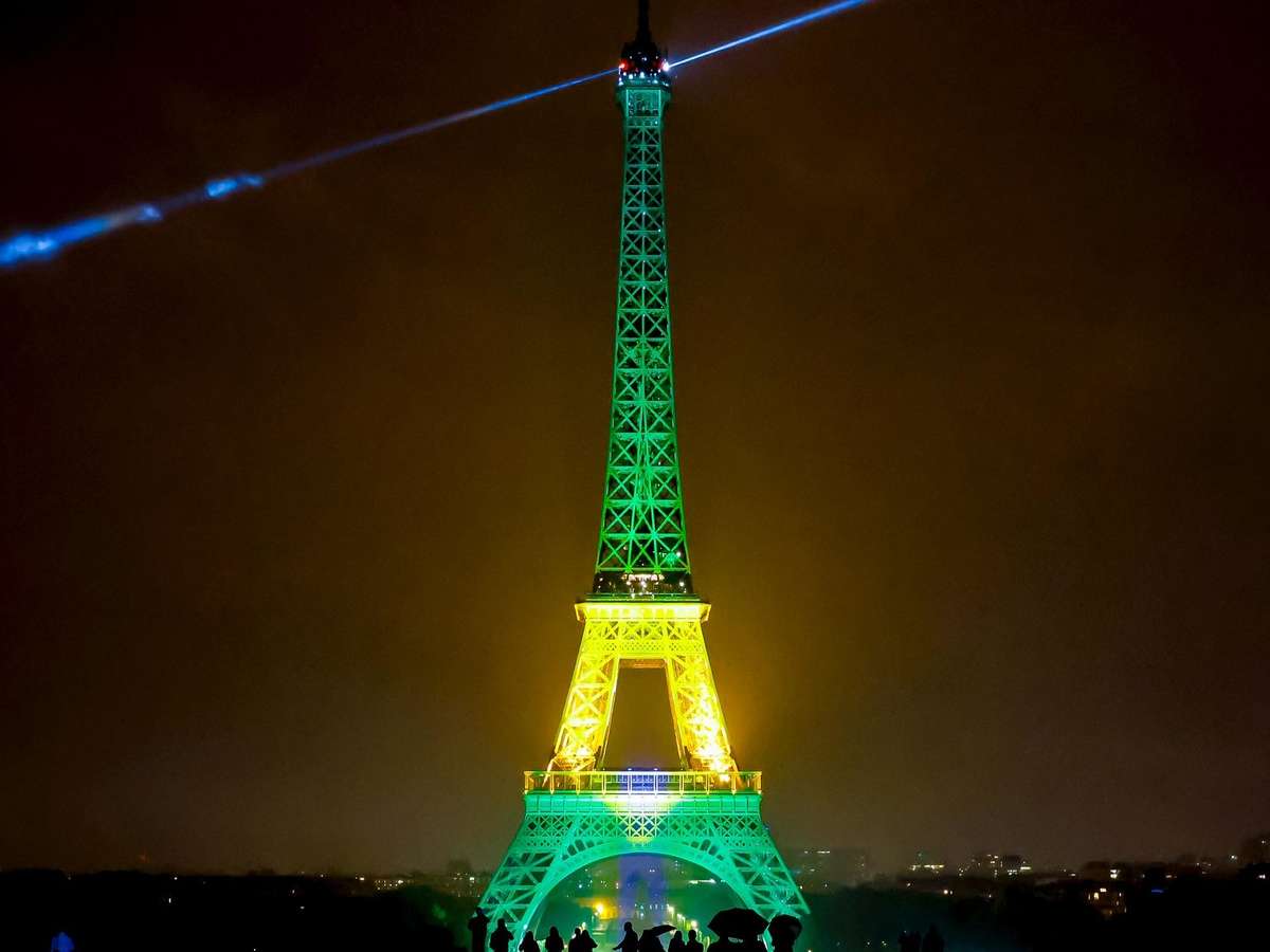 A Torre Eiffel foi iluminada com as cores verde e amarela na noite desta quinta-feira, 5.