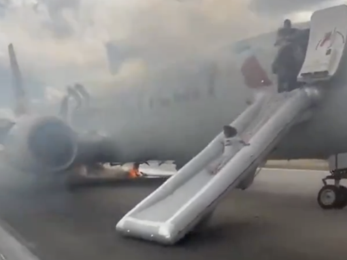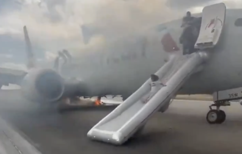 Trem de pouso de avião pega fogo nos EUA; passageiros descem pelas escorregadeiras