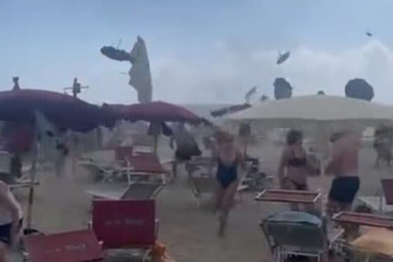 A força do vento causou um tornado que literalmente lançou os guarda-sóis da areia a vários metros de altura na praia de Maccarese.
