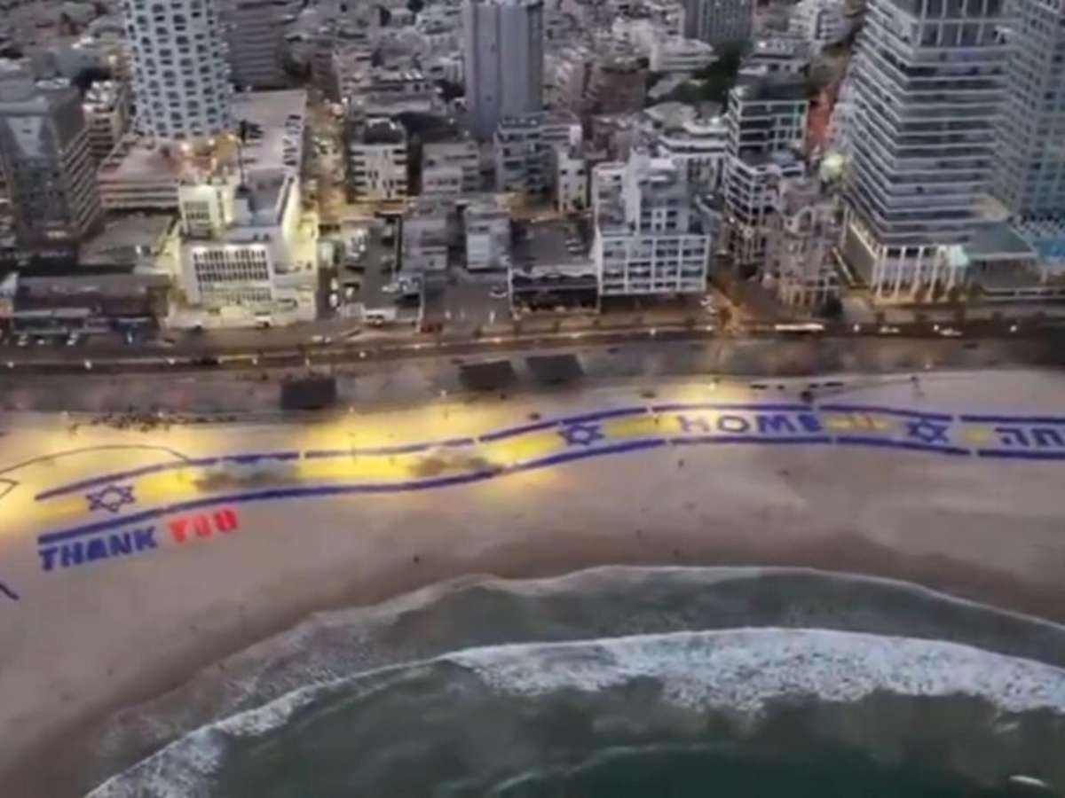 Uma enorme faixa na areia da praia de Tel Aviv, em Israel, homenageou nesta segunda-feira (13) o presidente dos Estados Unidos, Donald Trump, como forma de agradecimento pelo seu papel crucial desempenhado no acordo de paz com o Hamas.