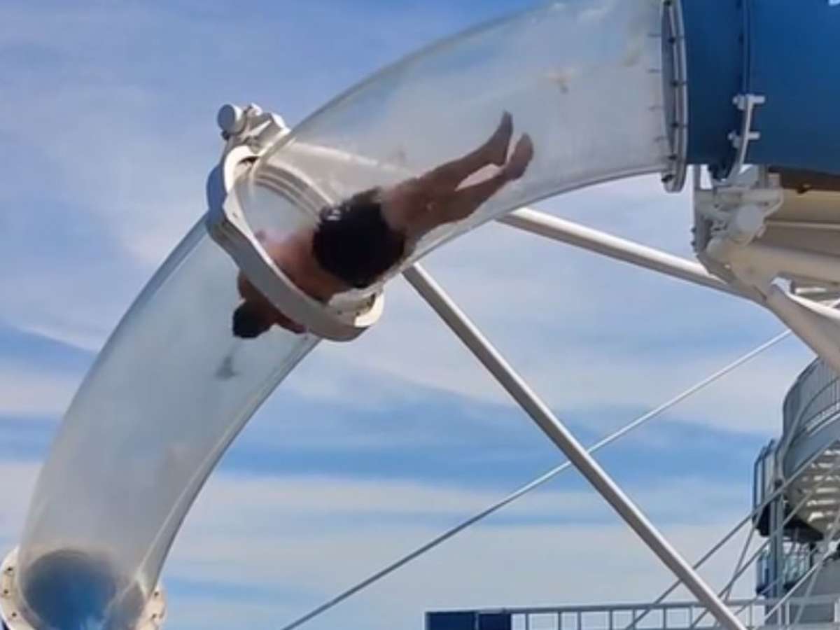 Uma passageira de cruzeiro ficou presa em um toboágua transparente 48 metros acima do mar. O vídeo que registra o incidente viralizou nas redes sociais foi gravado por um outro turista não identificado.