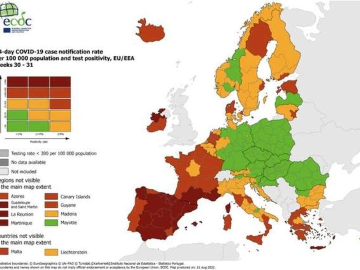 A maior parte da Grécia, França, Holanda, Bélgica, Dinamarca e Suécia, além de todas as regiões de Portugal e Malta, estão na zona vermelha, onde há entre 200 e 500 casos por 100 mil habitantes.