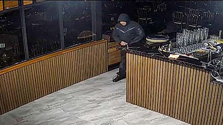 Nas imagens, é possível ver um homem entrando no restaurante Al Marjan, em Campbellfield, após arrombar a porta com uma Mercedes-Benz E240 prata. Vestido de preto e com capuz, ele despeja um líquido de um galão em várias partes do restaurante. Durante a ação, escorrega e desliza no chão.