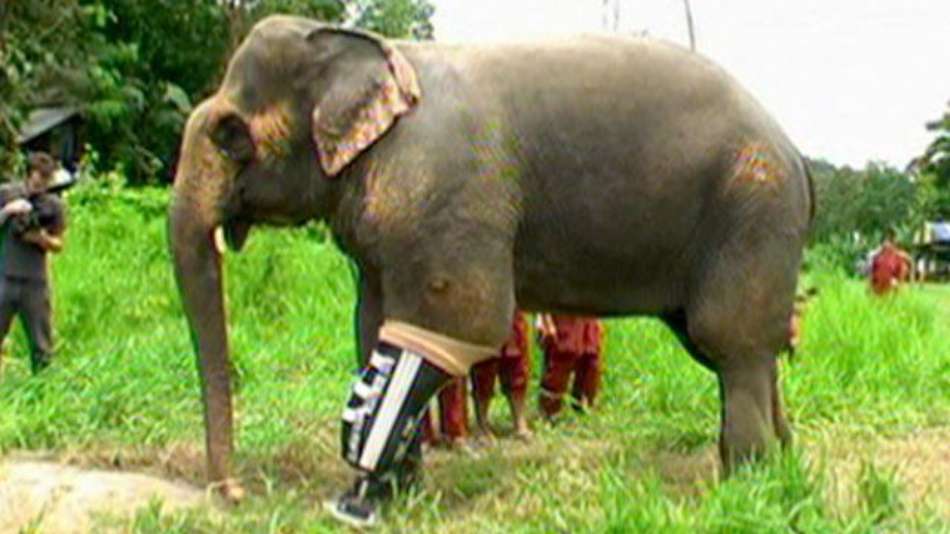 Mundo Após 10 anos, elefante ganha prótese para a perna Exibir comentários Compartilhar Motala perdeu a perna ao pisar em uma mina terrestre em Myanmar; prótese é conquista de defensores dos direitos dos animais Reuters Publicidade
