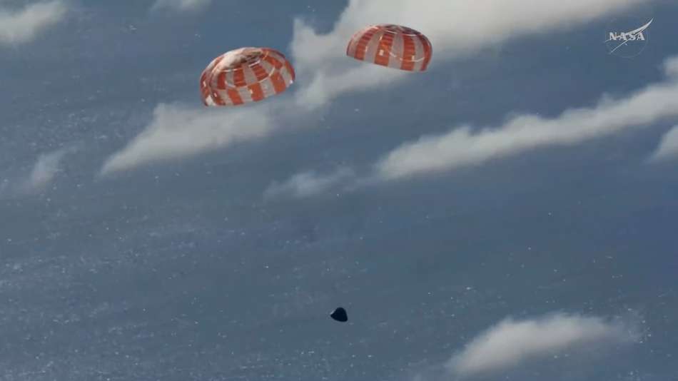 Uma das etapas mais críticas da missão, o pouso foi concluído na noite desta sexta, 10, na costa de San Diego, nos Estados Unidos. Dois kits de paraquedas foram liberados durante a operação para estabilizar a cápsula e reduzir a velocidade da queda para 32 km/h. Após o pouso, o capitão Reid Wiseman confirmou que todos os integrantes da missão passavam bem e aguardavam a operação de retirada. Crédito: Reprodução/YouTube/Nasa