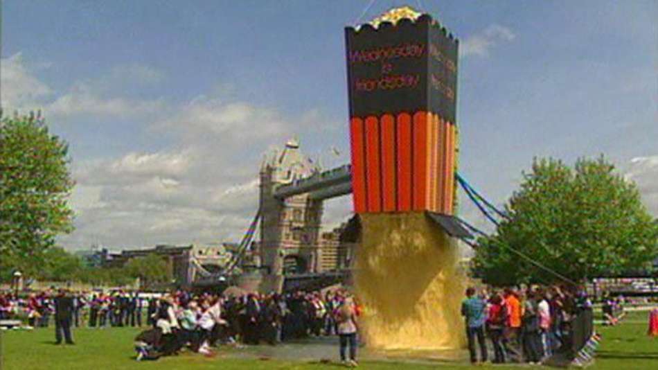 Mundo Balde gigante despeja 1 t de pipoca em Londres Exibir comentários Compartilhar Ação promocional de empresa de telefone celular distribuiu prêmios para dezenas de pessoas na Tower Bridge Reuters Publicidade