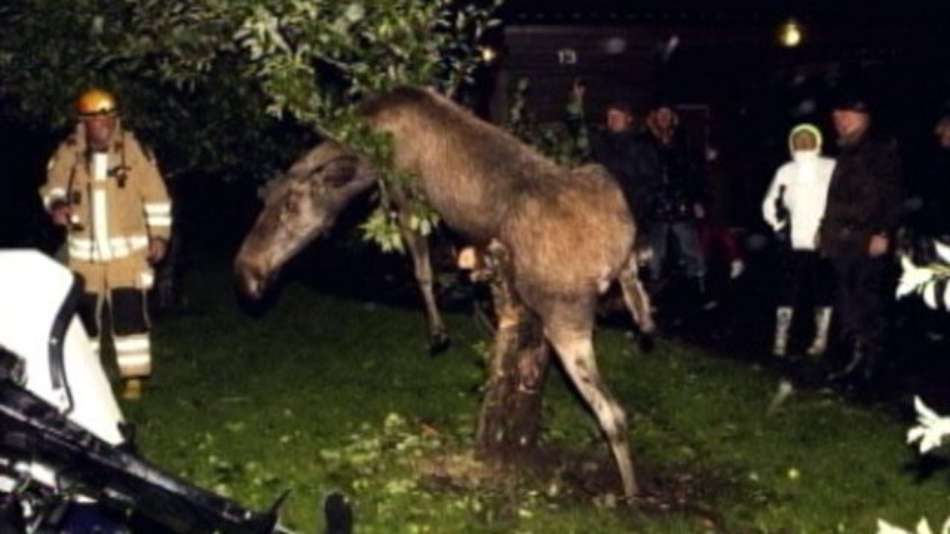 Mundo Embriagado, alce fica entalado em árvore após comer maçã Exibir comentários Compartilhar Segundo autoridades, o animal ficou 'bêbado' após comer fruta fermentada na Suécia Reuters Publicidade