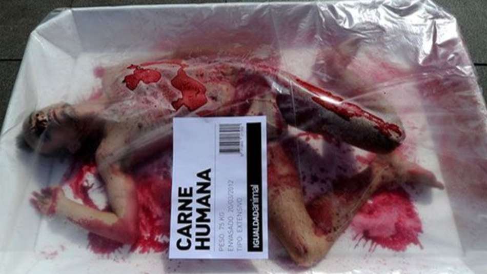 Mundo Grupo faz protesto "sangrento" contra consumo de carne Exibir comentários Compartilhar Cobertos de sangue falso, ativistas se deitam em bandejas embaladas com plástico representando carne humana, na Espanha Atlas Publicidade