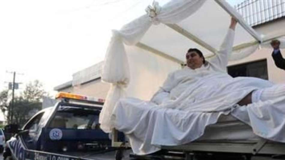 Mundo Guindaste ajuda mexicano a se casar Exibir comentários Compartilhar Manuel Uribe, mais gordo do mundo, foi levado ao altar em um guindaste acompanhado por um cortejo de dezenas de curiosos Atlas Publicidade