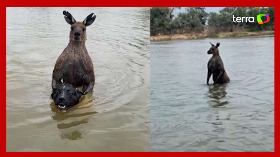 Policial troca socos com canguru para salvar cachorro. O policial aposentado registrou o episódio que ocorreu no último final de semana na Austrália. Um canguru pegou um de seus cachorros e o segurou dentro de um rio. Para salvar o amigo de quatro patas, o homem entrou na água e avançou contra o canguru. Durante a troca de socos o celular com o marsupial, o celular do homem caiu no rio. Após recuperar o aparelho, é possível ver que o cão conseguiu escapar e o canguru permanece em posição de ataque.