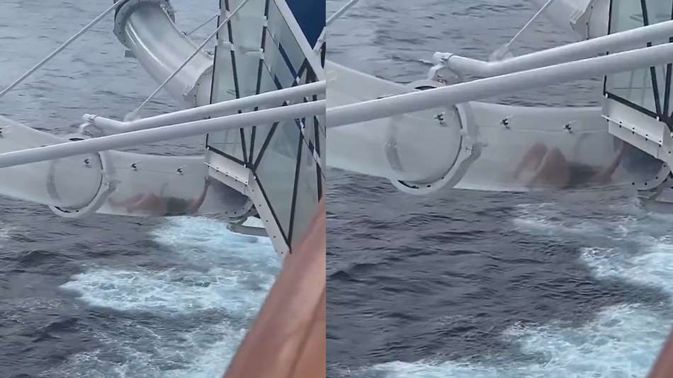 O vídeo que registra o incidente, que ocorreu em um cruzeiro de sete dias pelo Alasca, viralizou nas redes sociais. Nas imagens, é possível ver a mulher de costas imóvel no brinquedo Ocean Loops em um navio da Norwegian Cruise Line. O toboágua transparente está localizado a 48 metros acima do mar. O registro também mostra a passageira tentando se mexer para escorregar, mas sem sucesso. Reprodução/Redes Sociais