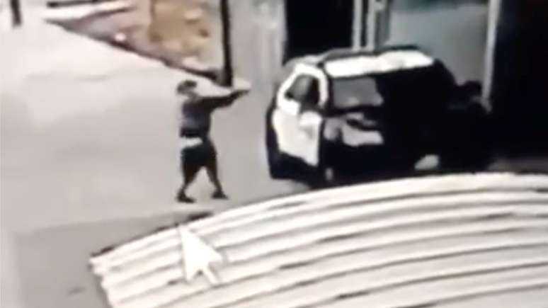 A gravação mostra uma pessoa se aproximando do veículo e, ao chegar ao lado dele, aponta a arma em direção à janela do lado do passageiro e começa a atirar. Em seguida, ele sai correndo.