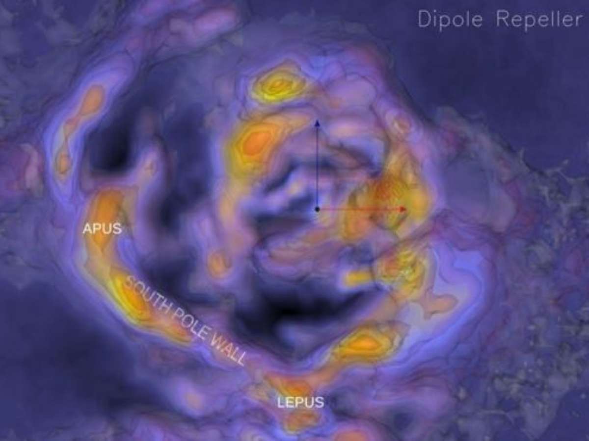 As imagens nos indicam que a Muralha do Polo Sul tem a forma de um arco que abrange as fronteiras do sul de um supergrupo de galáxias chamado Laniakea, que significa céu imenso no idioma havaiano.