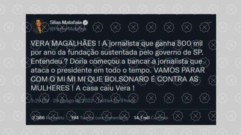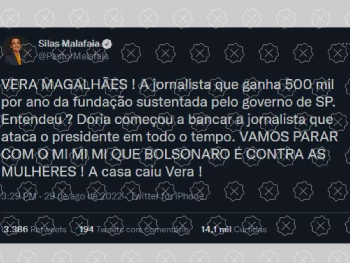 A desinformação foi publicada pelo pastor Silas Malafaia no Twitter e já acumula mais de 3.500 compartilhamentos na rede social. No Facebook, postagens com a mesma informação enganosa também foram compartilhadas centenas de vezes.