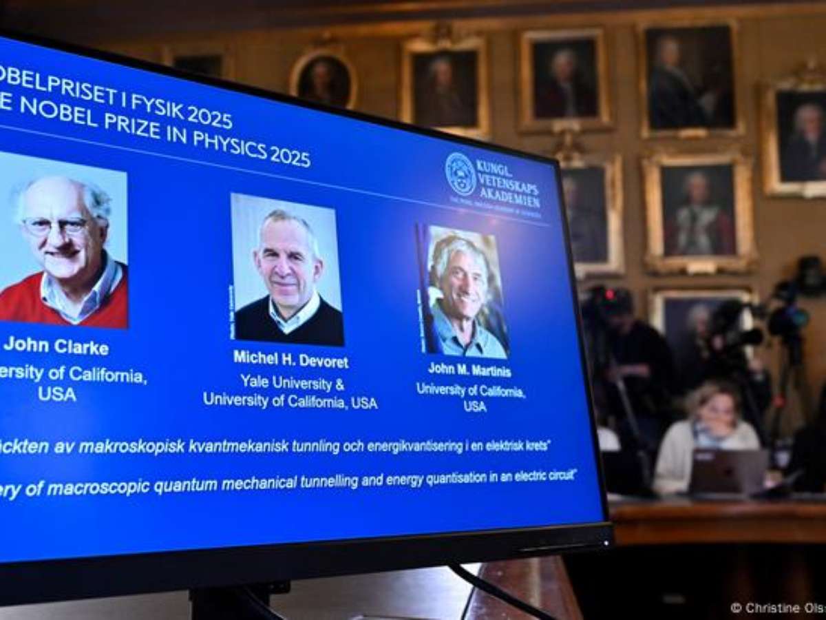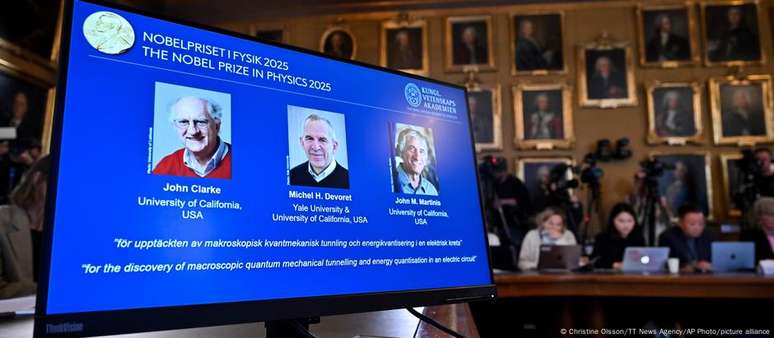 Três americanos da Universidade da Califórnia demonstraram que as propriedades da física quântica podem ser concretizadas em escala macroscópica por meio de experiências com um chip.O Prêmio Nobel de Física de 2025 foi concedido ao britânico John Clarke, ao francês Michel Devoret e ao americano John Martinis pela "pela descoberta do efeito túnel macroscópico da mecânica quântica e da quantização da energia em um circuito elétrico", anunciou a Real Academia Sueca de Ciências nesta terça-feira (07/10), em Estocolmo.