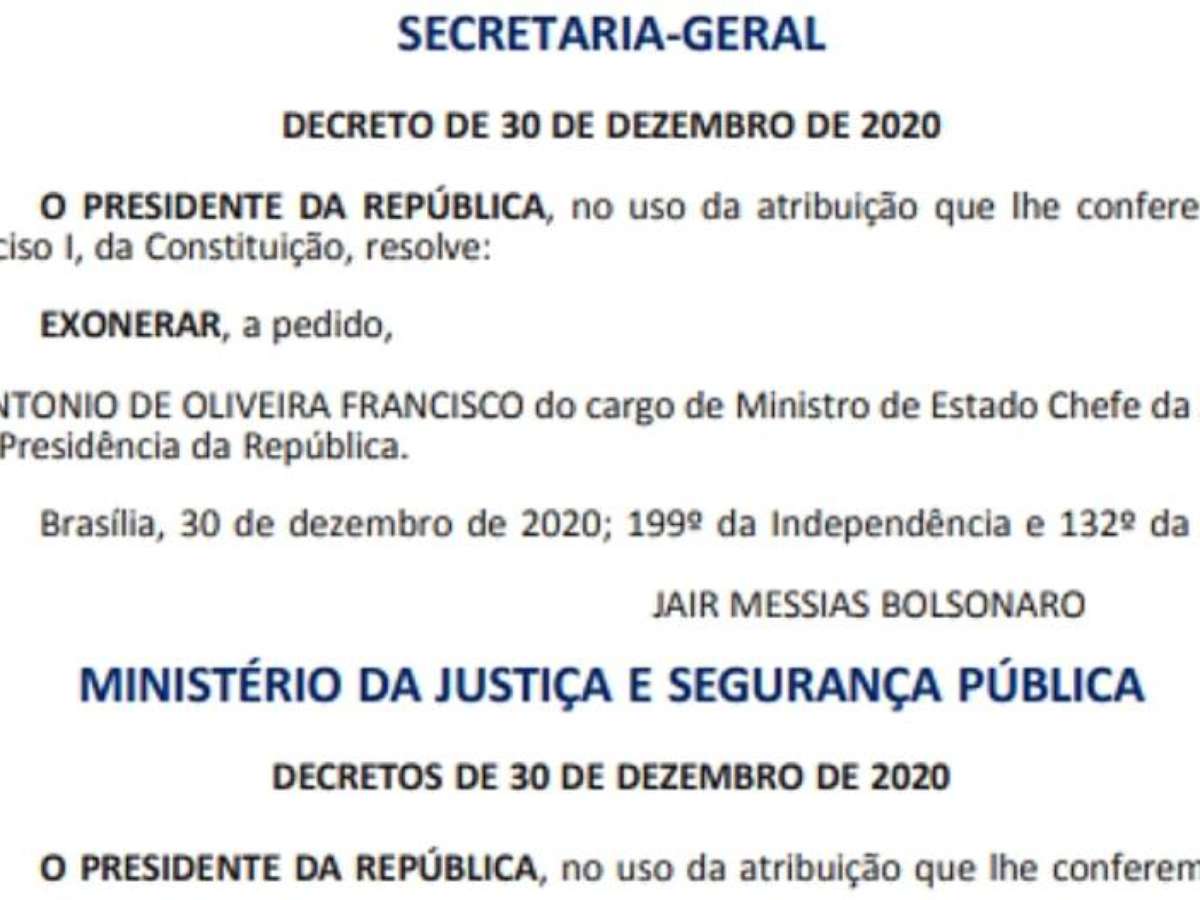 A exoneração de Oliveira já estava prevista. Ele foi indicado para o TCU pelo presidente Jair Bolsonaro em outubro e depois teve o nome aprovado pelo Senado. Seu substituto na Secretaria-Geral ainda não foi divulgado. Oliveira assume a vaga do TCU no lugar do ministro José Múcio Monteiro Filho, que se aposenta.