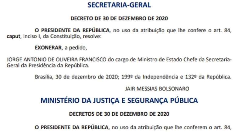 O decreto com a exoneração de Jorge Oliveira do cargo de ministro da Secretaria-Geral da Presidência da República foi publicado em edição desta quinta-feira, 31, do Diário Oficial da União, junto com sua nomeação para o cargo de ministro do Tribunal de Contas da União (TCU).