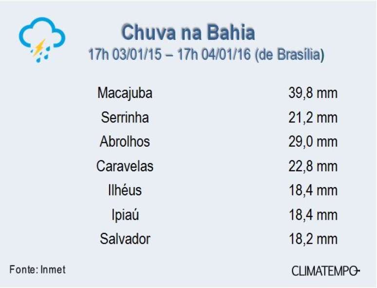 A tabela mostra alguns volumes acumulados entre 17 horas do dia 3 e 17 horas de 4 de janeiro de 2016. Em Macajuba, os 21 mm caíram em apenas 1 horas.