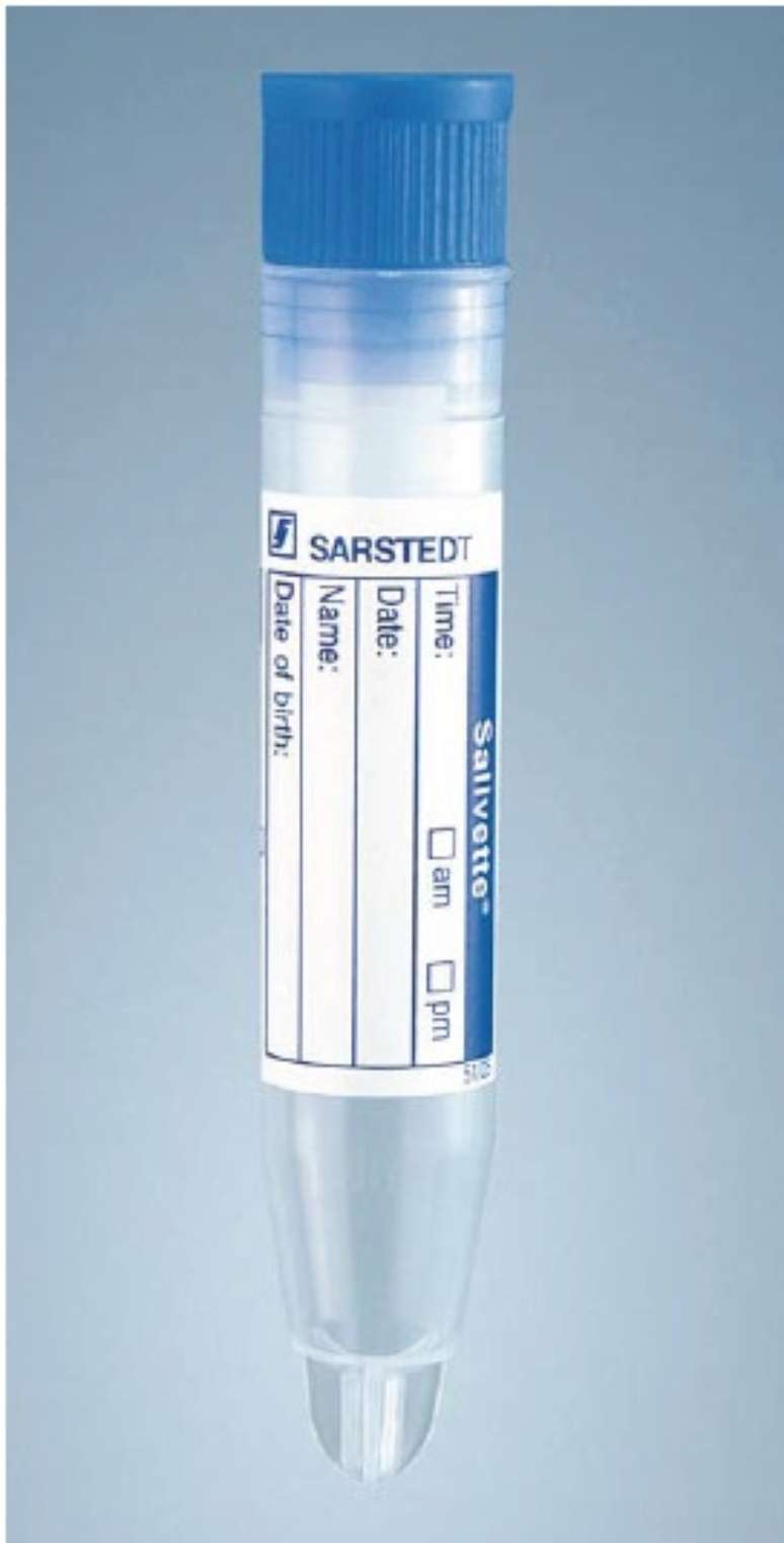 A obtenção de material por meio da saliva é uma opção menos invasiva. Até o próprio paciente pode coletar sua amostra, sem a necessidade da ida ao laboratório, o que causa menos estresse ou algum tipo de trauma ao indivíduo. O dispositivo utilizado para a coleta desse fluído oral é constituído por um tubo de plástico em formato de cone, com uma base inserida nesse tubo e um algodão. No laboratório, sua manipulação consiste basicamente em uma centrifugação, agilizando os procedimentos pré-analíticos. Existe, na literatura farmacêutica, estudos sobre o dispositivo desde 1989.