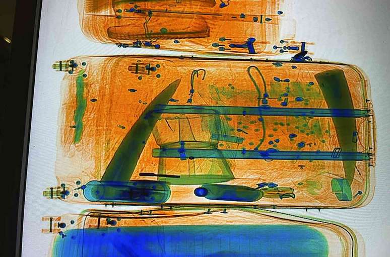 Uma imagem de raio-X da bagagem mostra chifres de rinoceronte embalados em uma bolsa.Interpol via APIA e ferramentas digitais para inspeção