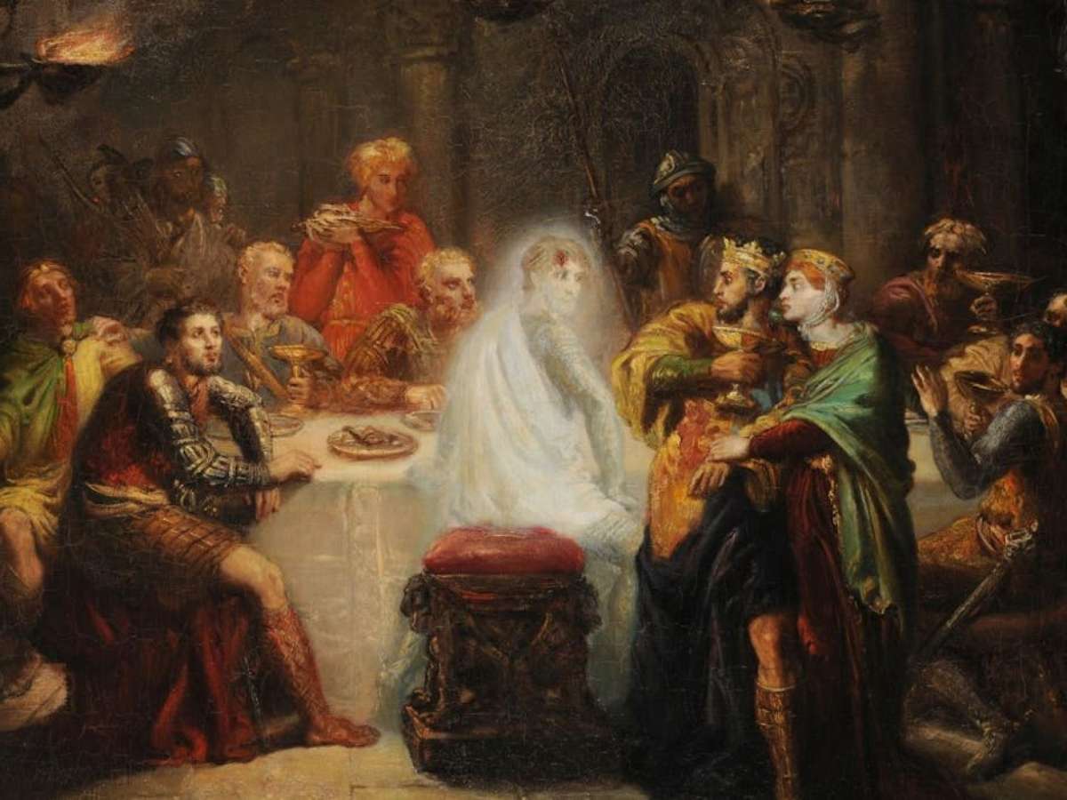 Na tragédia Macbeth, do dramaturgo inglês William Shakespeare, o protagonista assassina seu amigo Banquo para proteger o trono usurpado. Durante um banquete, o fantasma de Banquo aparece e se senta à mesa, visível apenas para Macbeth, que entra em pânico diante dos convidados. A cena tornou-se metáfora clássica da tentativa de dialogar com algo que não existe mais - uma presença imaginada que ocupa um lugar vazio, perturbando quem insiste em vê-la enquanto os demais observam, desconcertados.