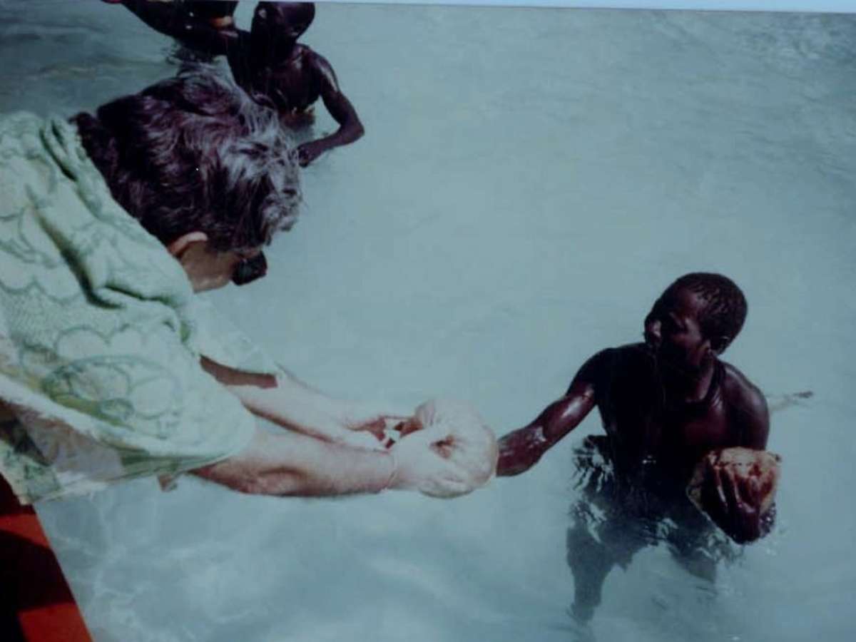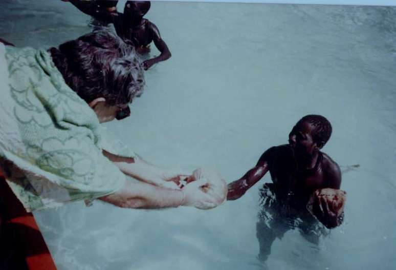 "Quando eu estava distribuindo cocos, me distanciei um pouco do resto do grupo e comecei a me aproximar da praia. Um garoto sentinela fez uma cara engraçada, pegou uma faca e sinalizou para mim que cortaria minha cabeça. Chamei imediatamente o barco e parti em retirada", se recorda.