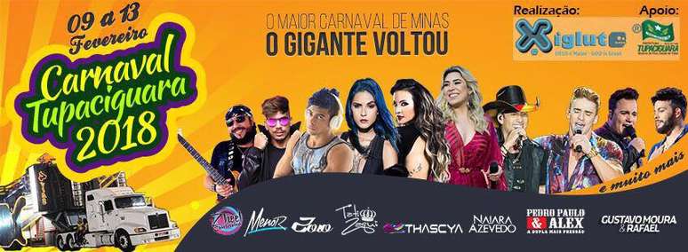 O maior carnaval de Minas, o carnaval da cidade de Tupaciguara em parceria com a rede social que mais cresce no mundo a Xiglute, está de volta, e promete ser o melhor de todos os carnavais até hoje. Com atrações grandiosas como: Nayara Azevedo, Éverson Zóio, Pedro Paulo e Aléx, Tati Zack, Dj Thascya, Mc Menor, Zeheel chicleteiro, Gustavo Moura e Rafael, Don Russo, carro de som e muito mais.