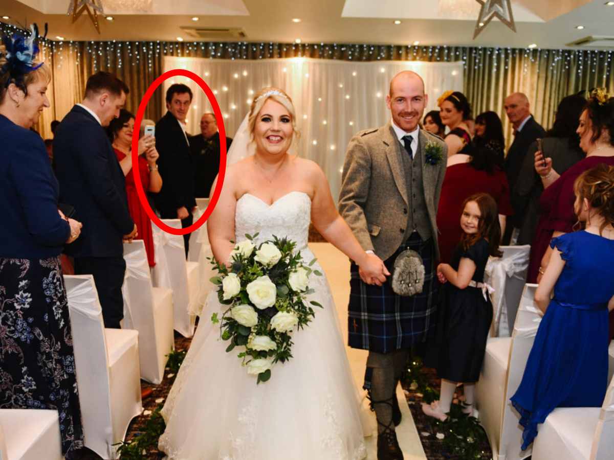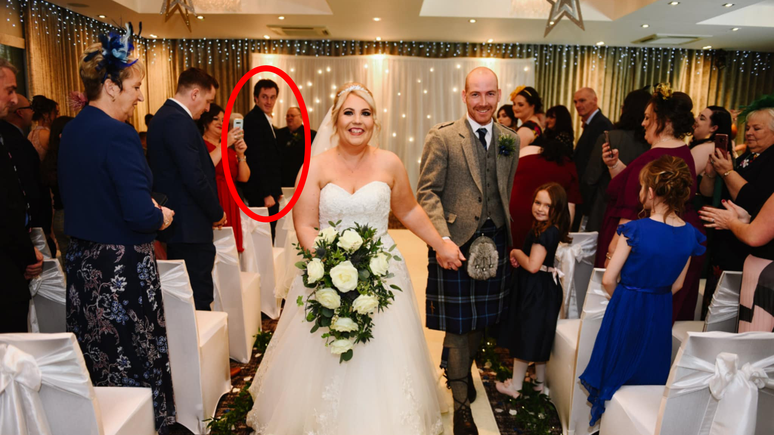 O casal só percebeu a presença do intruso ao receber as fotos do grande dia: um homem alto, de terno escuro, com expressão visivelmente confusa.