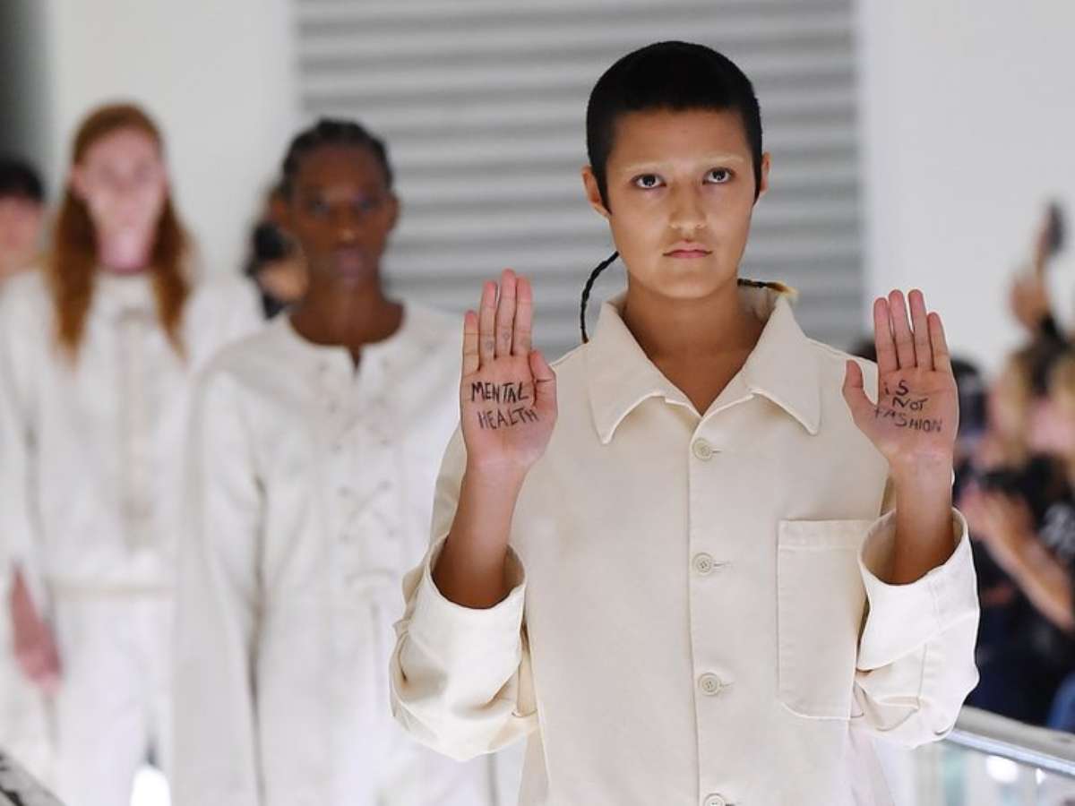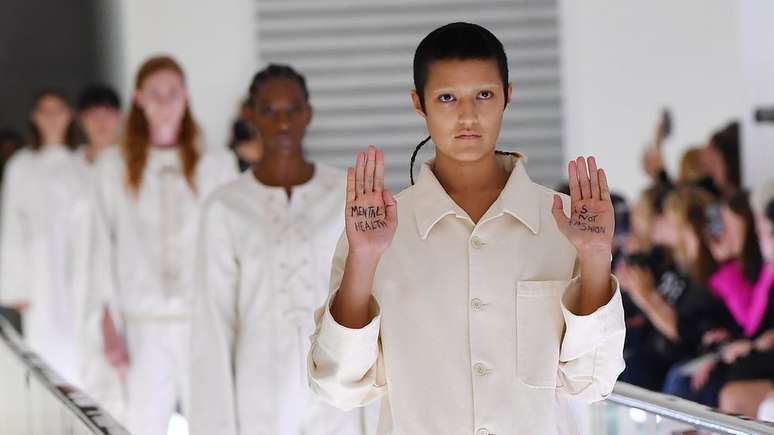 Tan-Jones, que se identifica como não-binário (que não pertence a um gênero exclusivamente), levantou os braços na passarela para mostrar a mensagem que tinha escrito na palma das mãos: "Saúde mental não é moda".