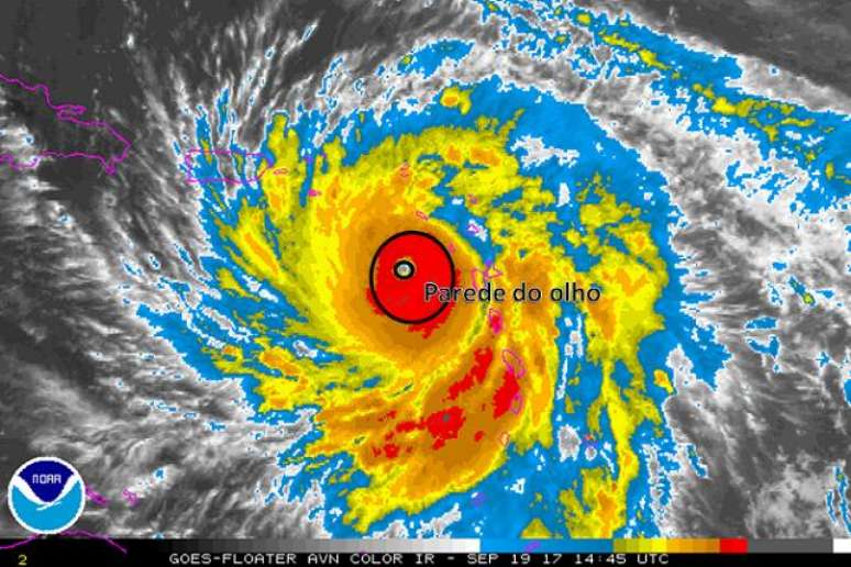 Imagem realçada do furacão Maria com destaque para a região da parede do olho. FONTE: NOAA