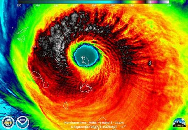 Imagem realçada do furacão Irma do das 02h35 (hora de Brasília) do dia 06 de setembro de 2017. Fonte: NOAA/CIMSS/JPSS