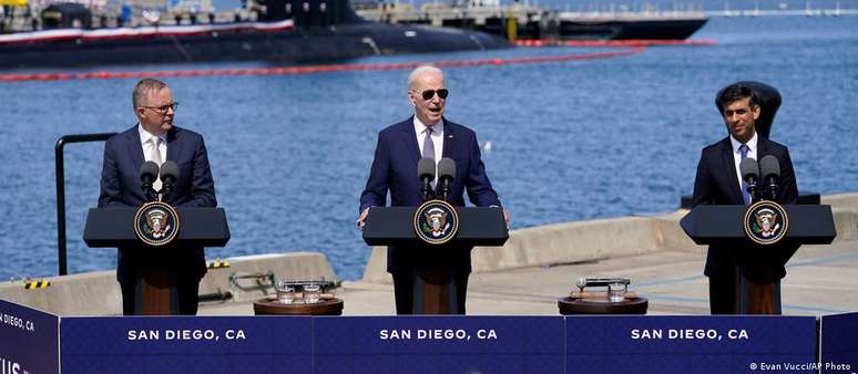 Acordo bilionário prevê aquisição de submarinos nucleares dos EUA pela Austrália, numa tentativa de diminuir influência chinesa no Indo-Pacífico. Pequim e Moscou dizem haver risco à não proliferação de armas atômicas.Estados Unidos, Reino Unido e Austrália revelaram nesta segunda-feira (13/03) novos detalhes do pacto de segurança Aukus, uma tentativa de fazer frente à crescente influência da China na região do Indo-Pacífico, causando imediata reação de Pequim.