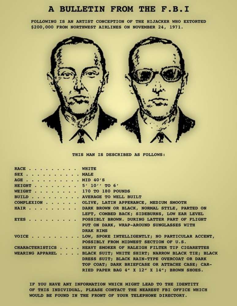 Trata-se de um dos maiores mistérios da história criminal americana. Levando em uma mochila o equivalente hoje a mais de US$ 1 milhão (R$ 4 milhões), o sequestrador saltou de paraquedas do avião e desapareceu — literalmente — em pleno ar.