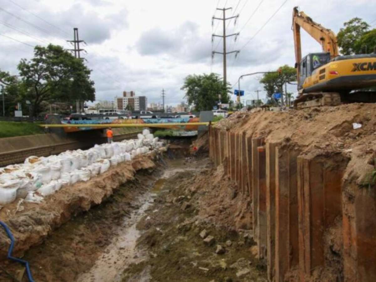 A primeira intervenção, realizada próxima à Estação de Bombeamento de Água Tratada (Ebat) São Manoel, já avançou significativamente. No local, o talude foi reforçado, provisoriamente, com estacas-prancha de oito metros de profundidade - que, na sequência, serão substituídas por uma espécie de muro. O curso do arroio Dilúvio foi desviado com o auxílio de sacos de ráfia, preenchidos por areia. Com isso, as margens podem ser usadas para o trânsito de trabalhadores e máquinas. A previsão é de conclusão das obras no trecho em setembro.