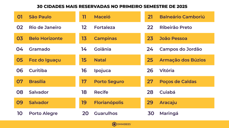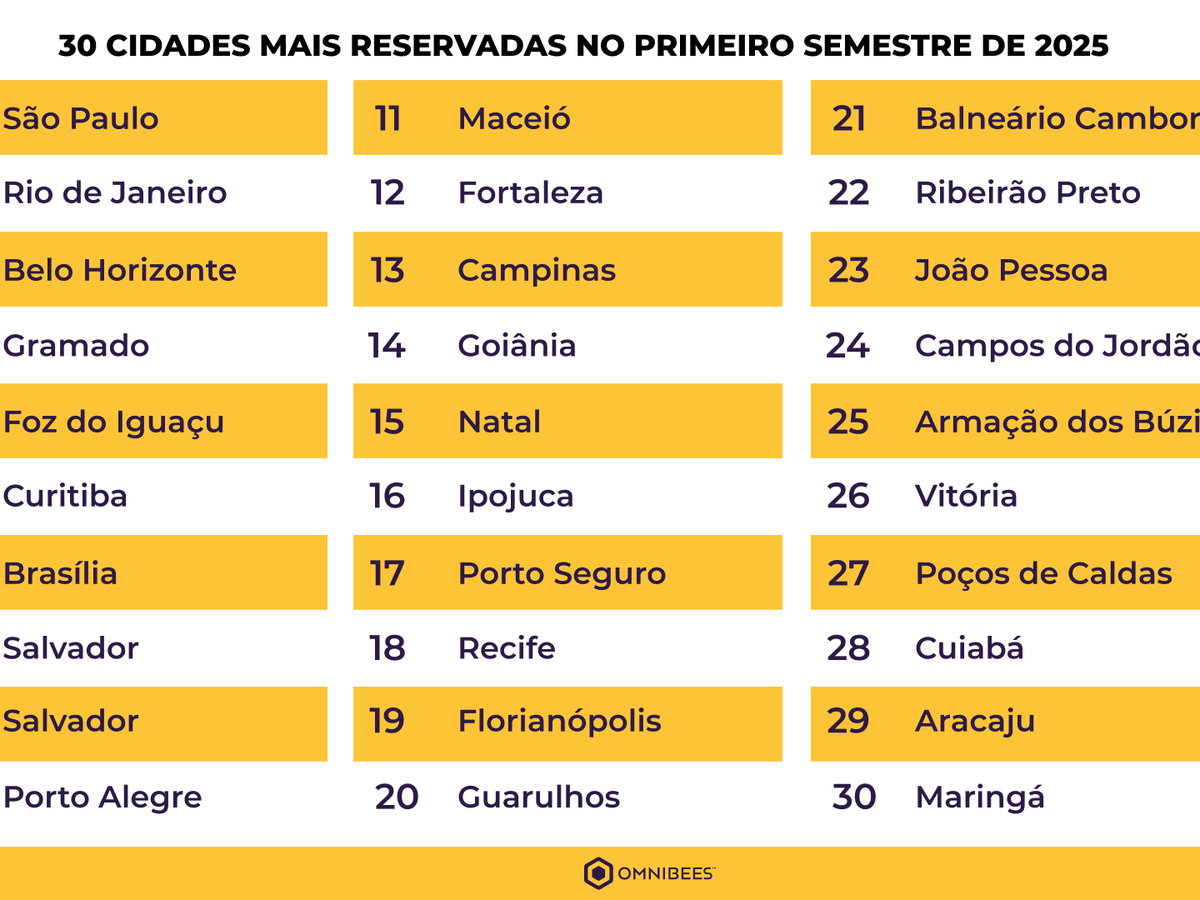 Dados colhidos pela plataforma de reservas Omnibees destacam as 30 cidades brasileiras mais reservadas no primeiro semestre de 2025: São Paulo, Rio de Janeiro, Belo Horizonte, Gramado, Foz do Iguaçu, Curitiba, Brasília, Salvador, Porto Alegre, Maceió, Fortaleza, Campinas, Goiânia, Natal, Ipojuca, Porto Seguro, Recife, Florianópolis, Guarulhos, Balneário Camboriú, Ribeirão Preto, João Pessoa, Campos do Jordão, Armação dos Búzios, Vitória, Poços de Caldas, Cuiabá, Aracaju, Maringá e Olímpia.